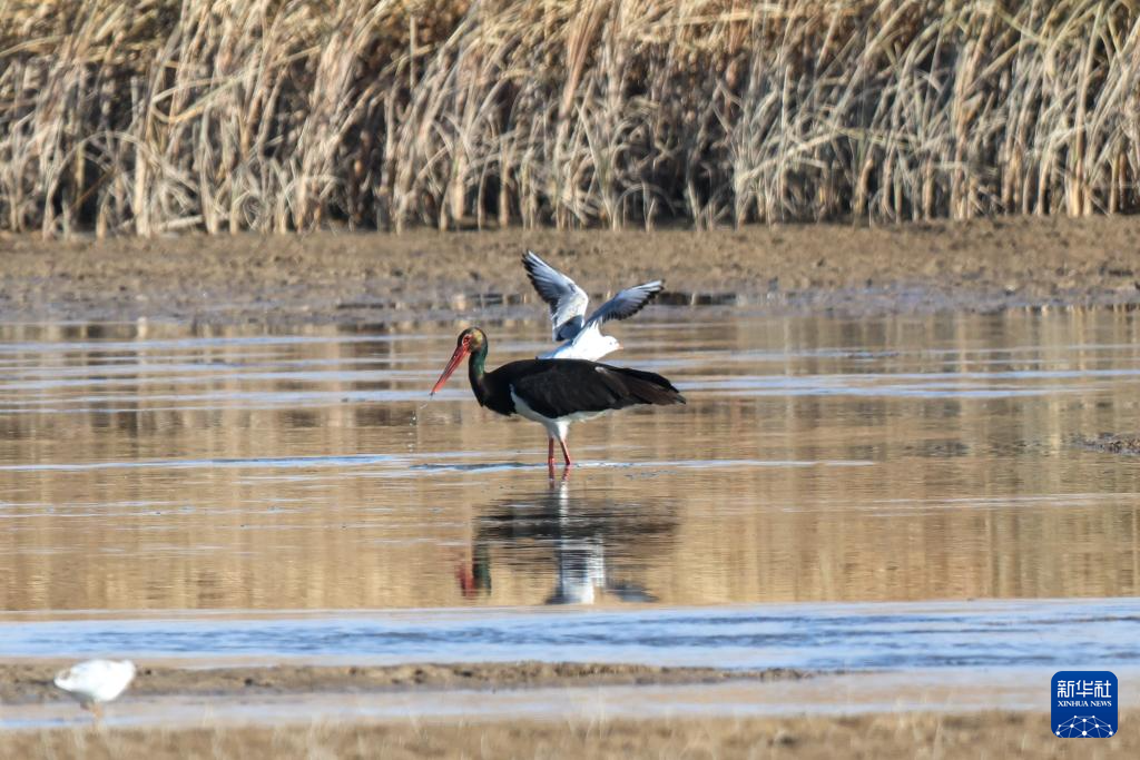 11月12日,在河西走廊中部的張掖黑河濕地國家級自然保護區(qū)高臺段,國家一級保護野生動物黑鸛在一處濕地淺灘覓食。