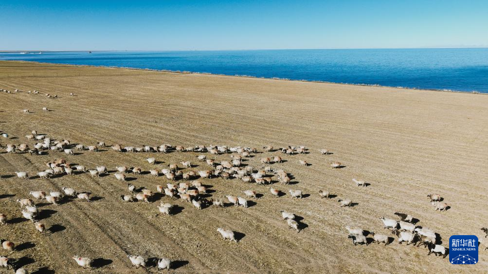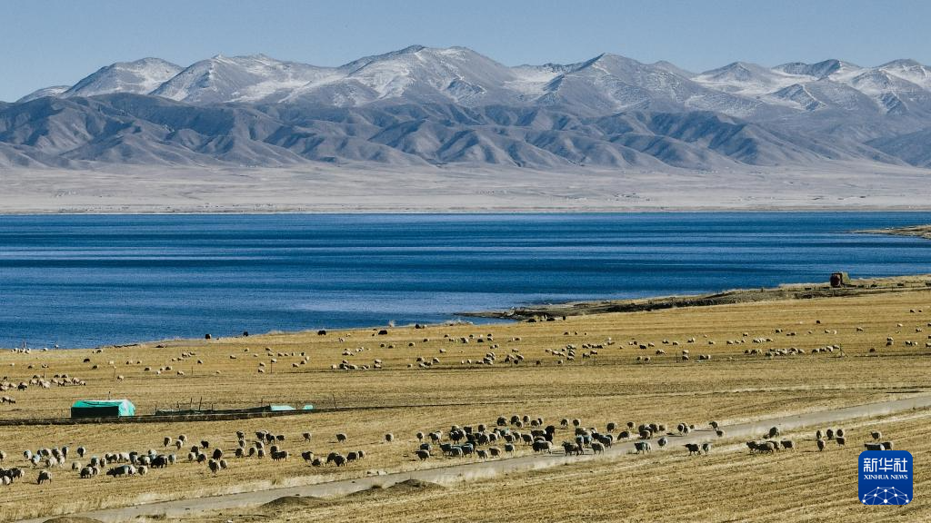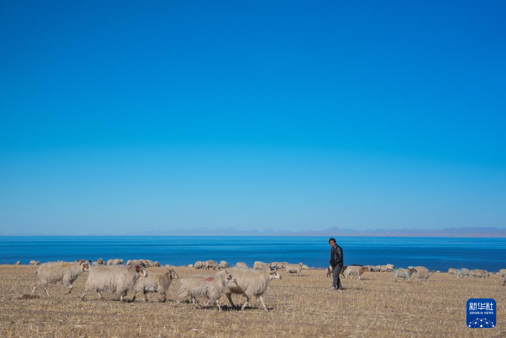 冬日,在青海省海南藏族自治州共和縣江西溝鎮(zhèn)附近的青海湖湖畔,牧民趕著羊群在這里放牧,湛藍的湖水與羊群相映成景,繪就一幅冬日牧羊圖。