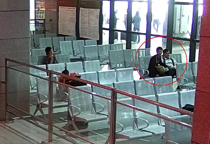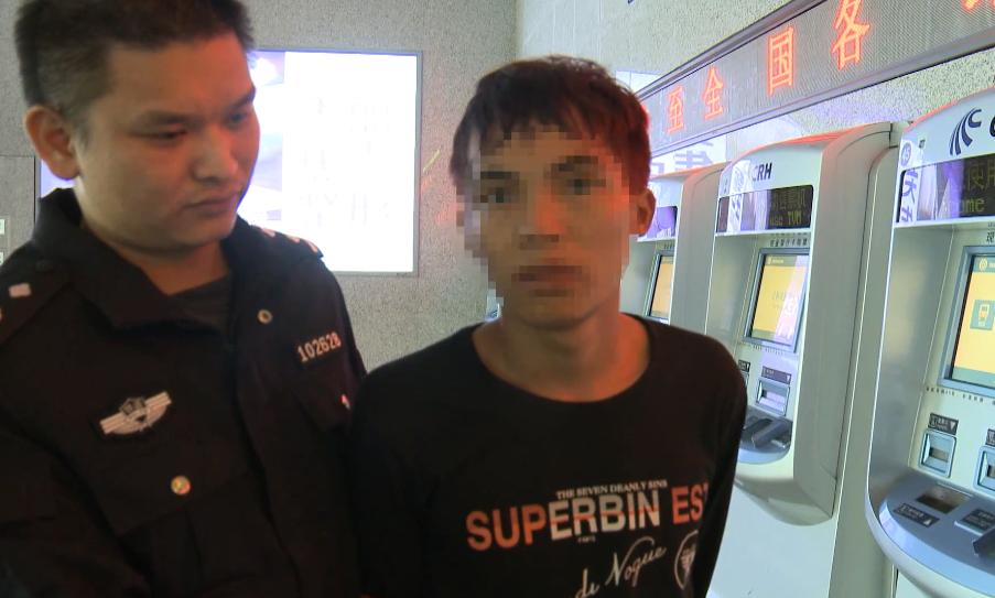 南寧鐵路公安處刑警七大隊民警莫善聰:注意看這名穿著黑色衣服的嫌疑人,這時他正在用身體進行掩護,左手取出他塞在退幣口的紙巾,另一只手取出堵在退幣口沒有掉下來的硬幣。