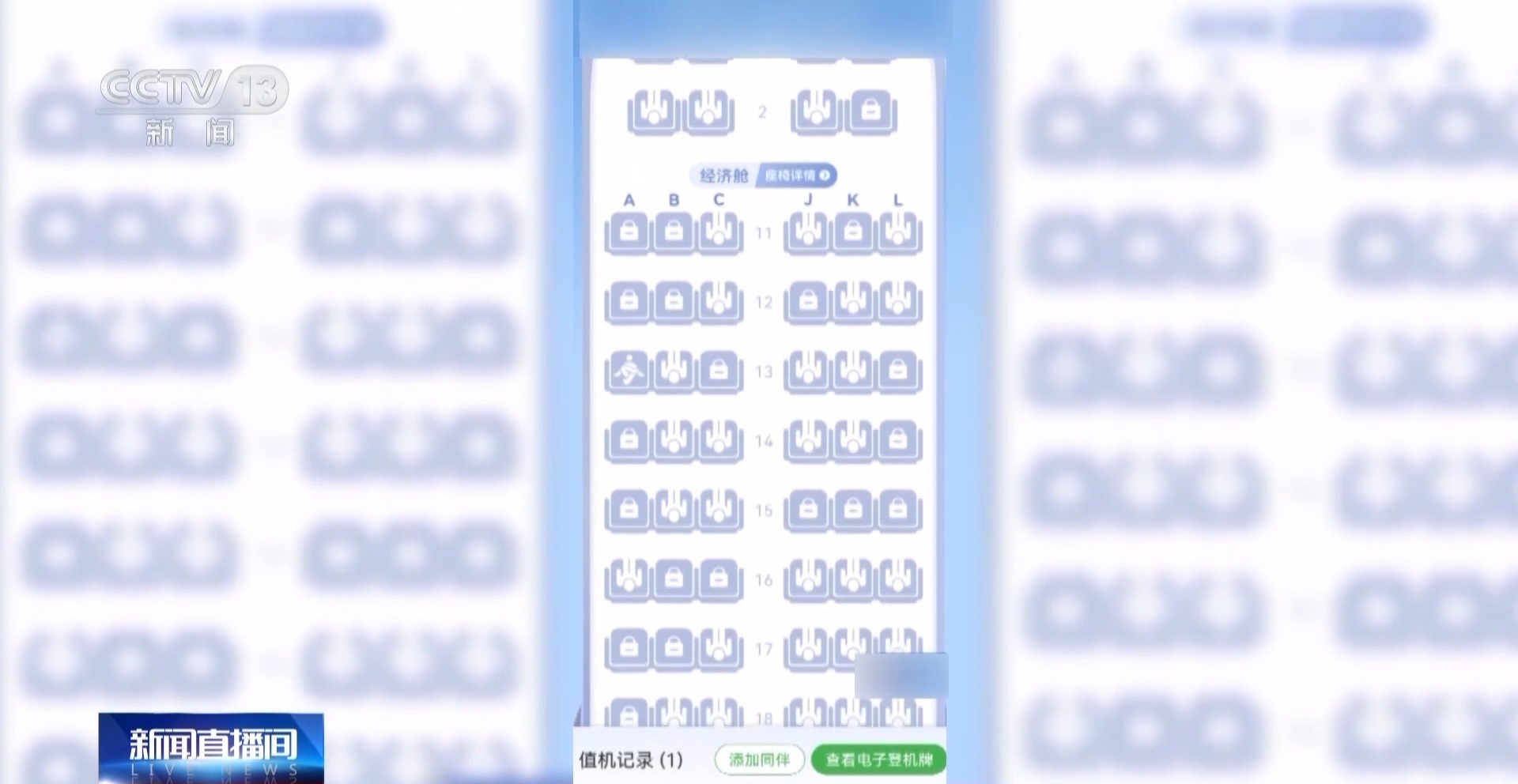 記者也預(yù)訂了一張從北京飛往烏魯木齊的機票,客艙一共176個座位,除安全出口外,客艙前后的座位都有不少被“鎖定”,尤其是經(jīng)濟艙前10排,幾乎每排靠窗和過道的座位都無法選擇。
