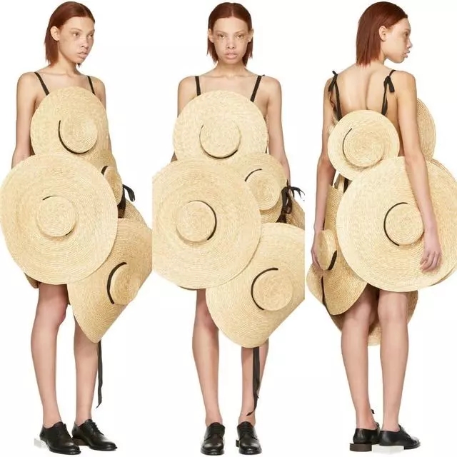 去年Jacquemus的創(chuàng)始人兼設(shè)計(jì)師的Simon Porte Jacquemus便推出了oversize超大號(hào)的硬質(zhì)平頂草帽,這款法國鄉(xiāng)村風(fēng)格的草帽上架立即銷售一空,隨即又在奢侈品零售電商Ssense推出一款全新夏裝——“Le Chapeau Santon”,全部由8頂草帽縫制而成,這條裙子沒有襯里,而且是100%的稻草,這可能會(huì)讓你有一種難以置信的穿衣體驗(yàn)。