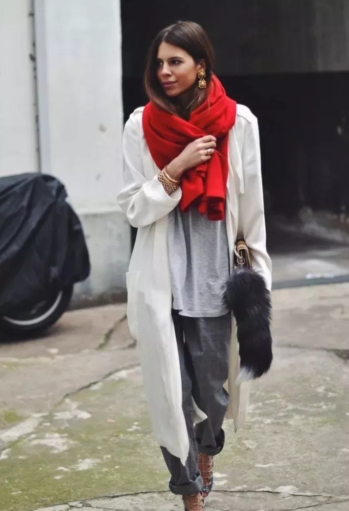 除了大紅色,磚紅色的圍巾更為顯得低調(diào)穩(wěn)重,有了圍巾的搭配,讓整體的造型更為協(xié)調(diào)。
