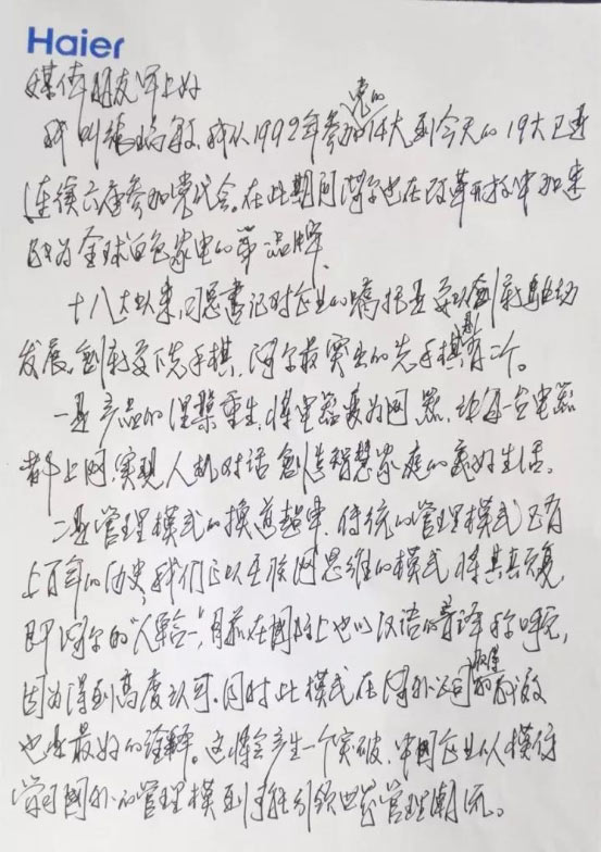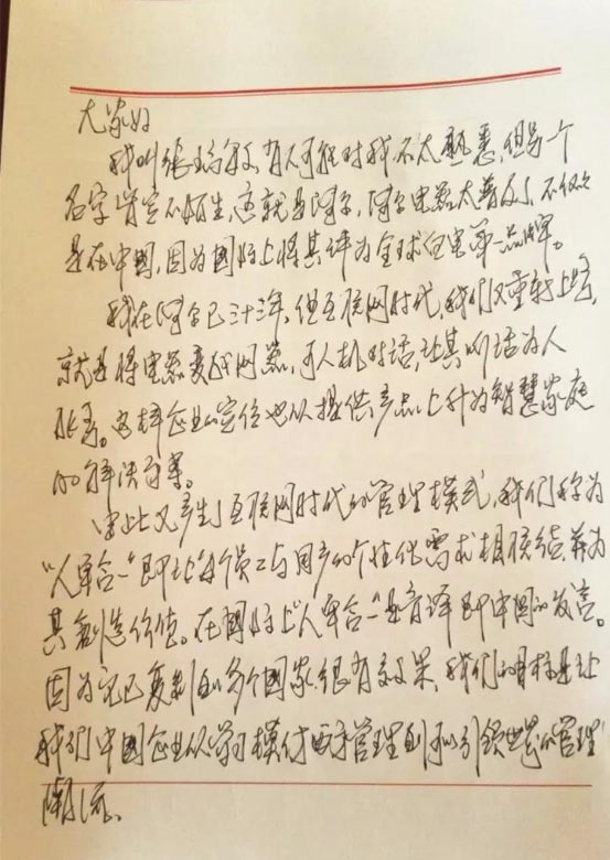 兩分鐘的自我介紹,張首席三易其稿,將自己深刻的思考用筆寫下。他從來不用秘書,在他看來,沒有人能代替自己思考。他也被專家學(xué)者譽(yù)為最有思想家氣質(zhì)的企業(yè)家、最有管理思想的企業(yè)家。