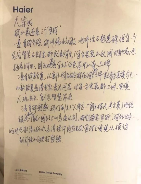 從三個(gè)“自我”,到兩個(gè)“先手棋”,從自我顛覆、自我超越,到涅槃重生、換道超車,張首席的三份手稿,體現(xiàn)了他作為中國企業(yè)家的自信。