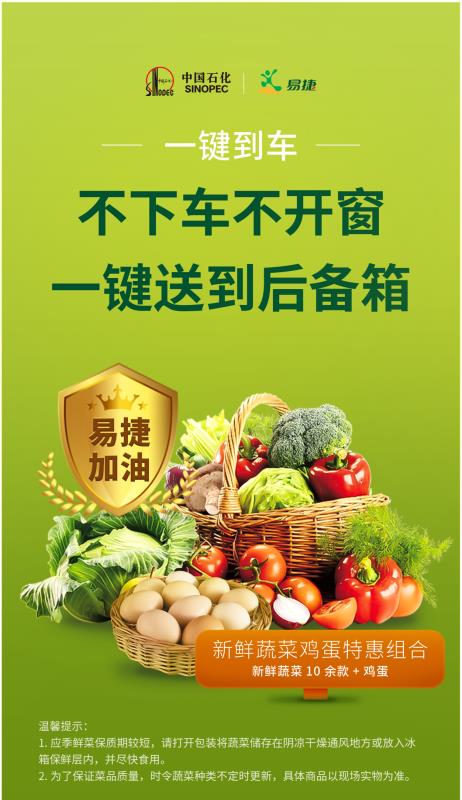 隨著疫情形勢不斷升級,北京石油積極拓展“一鍵到車”服務(wù)內(nèi)容,在確保加油現(xiàn)場安全衛(wèi)生、油品供應(yīng)充足的同時,主動與首都主要蔬菜供應(yīng)企業(yè)取得聯(lián)系,利用加油站網(wǎng)點多、供應(yīng)渠道快捷的便利,推出了“安心買菜”業(yè)務(wù),為首都市民提供安全衛(wèi)生快捷便利優(yōu)惠的新鮮蔬菜。顧客通過“易捷加油”APP中的“一鍵加油”下單后,在“配送到車”頁面選擇“蔬菜禮包組合”進行購買即可。