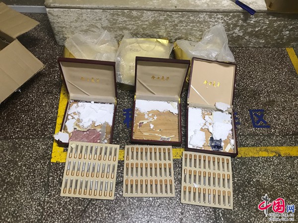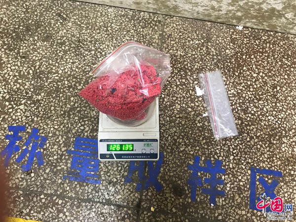 10月8日,該支隊(duì)瀾滄邊境檢查站執(zhí)勤民警在公開查緝中對(duì)一輛物流車輛檢查時(shí)發(fā)現(xiàn),一個(gè)寄往內(nèi)地的快遞包裹散發(fā)一股異味,民警立即對(duì)該包裹進(jìn)行細(xì)致檢查。經(jīng)檢查發(fā)現(xiàn),該快遞包裹內(nèi)裝有三盒冬蟲夏草,而用于裝冬蟲夏草的三個(gè)木質(zhì)禮盒底部均有大量膠水粘過的痕跡,用手敲擊發(fā)現(xiàn)盒子底部是中空的,經(jīng)驗(yàn)豐富的緝毒民警判定其內(nèi)部可能藏有違禁物品。在對(duì)三個(gè)木質(zhì)禮盒進(jìn)行拆解后,當(dāng)場(chǎng)從盒子底部查獲用藍(lán)色紙張包裹的冰毒片劑3塊,共計(jì)1.26公斤。目前,該案正在進(jìn)一步偵辦中。