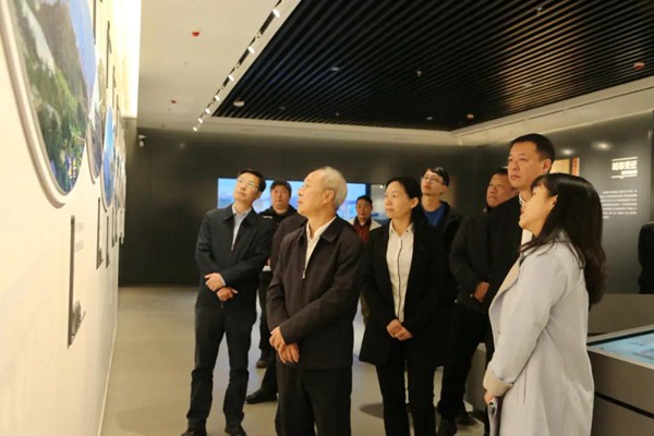 (姚國華(左一)在彌勒城市規(guī)劃展覽館調(diào)研建設(shè)和布展情況)