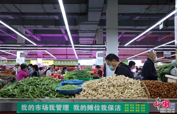 10月29日,五華區(qū)春之城標(biāo)準(zhǔn)化農(nóng)貿(mào)市場內(nèi),果蔬菜品碼放整齊,購物環(huán)境干凈整潔。每個(gè)攤鋪上都貼有“我的市場我管理,我的攤位我保潔”的文明標(biāo)語,穿著統(tǒng)一“馬甲”工作服的清潔人員正在緊張工作,市場內(nèi)一派熱鬧景象,前來買菜的市民絡(luò)繹不絕。