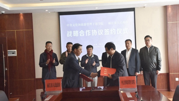 主題宣講活動(dòng)后,麗江市人民政府與中央文化和旅游管理干部學(xué)院簽訂了戰(zhàn)略合作協(xié)議。麗江市委常委、常務(wù)副市長(zhǎng)木崇根,中央文化和旅游管理干部學(xué)院院長(zhǎng)周慶富代表雙方簽字,根據(jù)協(xié)議,雙方將在人才培訓(xùn)、師資支持、文旅研究咨詢等方面加強(qiáng)合作。