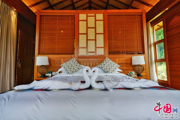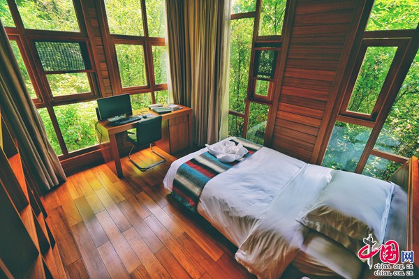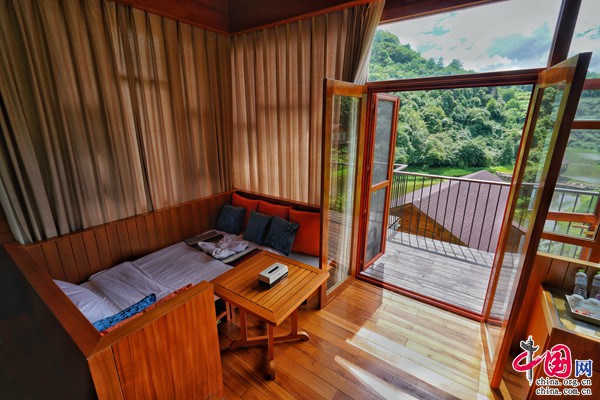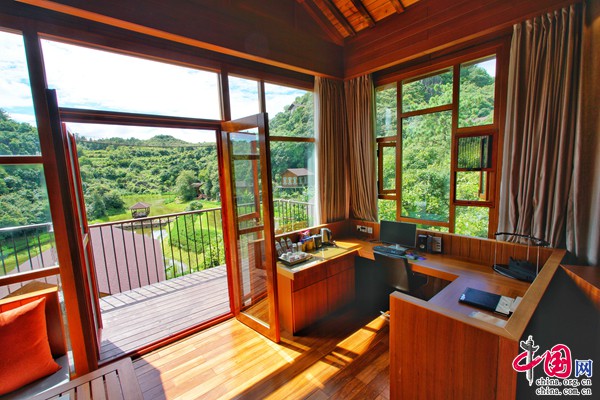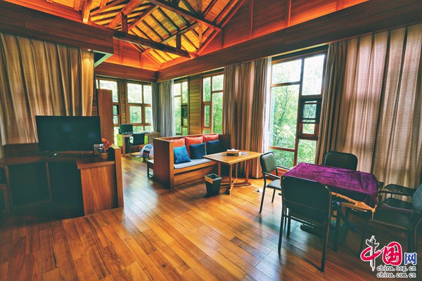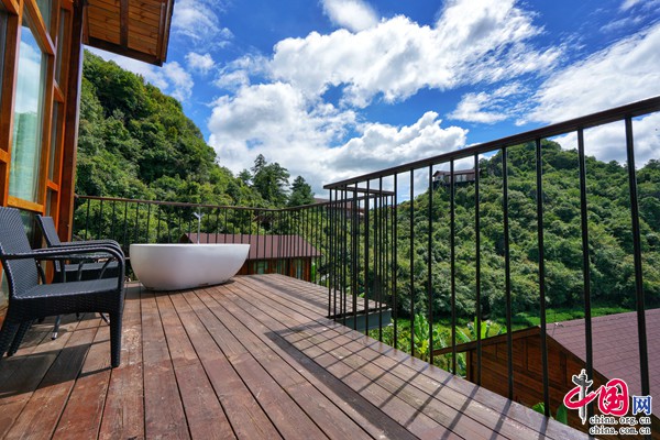 全木質(zhì)結(jié)構(gòu)的別墅,三面環(huán)窗,窗外草木蔥蘢,歲月靜好,讓人靜享歸隱山林之樂。房間內(nèi)還設(shè)有大泡池,可以欣賞景區(qū)全景。寬闊陽(yáng)臺(tái)搭配戶外織布床墊、桌椅、餐椅,可隨時(shí)隨地欣賞山水風(fēng)光。