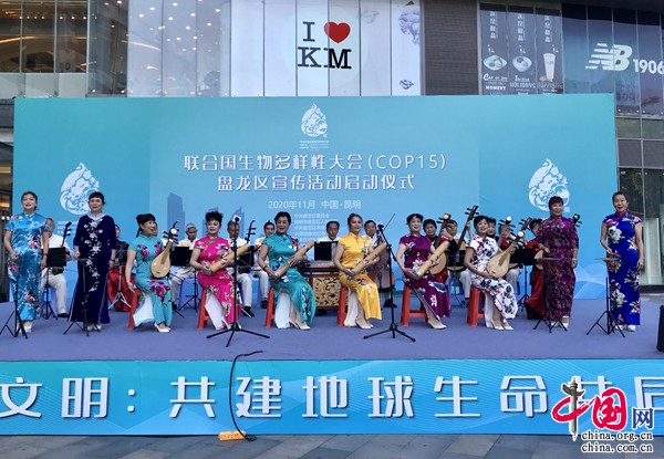 活動現(xiàn)場,區(qū)文化館月光翎藝術(shù)團表演佤族舞蹈《銀鐲》、區(qū)文化館昆明人藝術(shù)團揚琴說唱《款款昆明十八鋪》。在現(xiàn)場觀眾及嘉賓的見證下,活動點亮代表七彩云南、七彩盤龍的COP15會徽彩燈,同步開展了盤龍區(qū)COP15城市展廳。