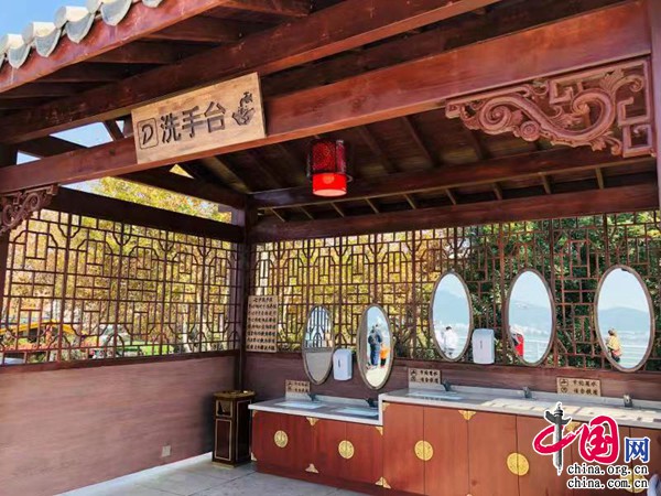 這兩座洗手臺(tái)整體呈棕紅色,全部使用木質(zhì)結(jié)構(gòu),并采用了最原始的榫卯工藝,沒用一顆螺絲、一根釘子;回字花紋的鏤空窗閣,既展現(xiàn)了濃郁的中式元素又通風(fēng)透氣,更濃縮了中式園林借景觀景的精髓;屋頂鋪設(shè)啞光青瓦,不會(huì)因滇池水面和屋頂互相折射反光造成光污染;洗手臺(tái)嵌入橢圓形梳妝鏡,柜門采用仿古鑲金邊工藝,輔以圓形拉環(huán)設(shè)計(jì),既美觀又實(shí)用。