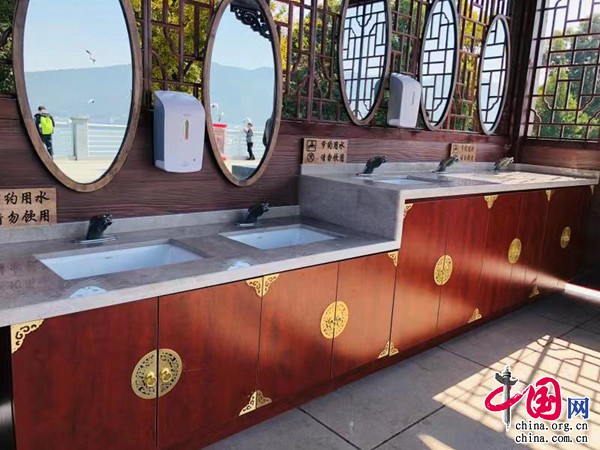 一抹淡淡的色彩,幾筆洗練的線條,兩座古色古香的中式洗手臺(tái)近日亮相云南滇池度假區(qū)海埂大壩,在觀鷗季為游客“勤洗手”提供了便捷。極具中國(guó)風(fēng)的洗手臺(tái)外觀,搭配上現(xiàn)代化的智能設(shè)備內(nèi)核,獲得了不少市民和游客的點(diǎn)贊。