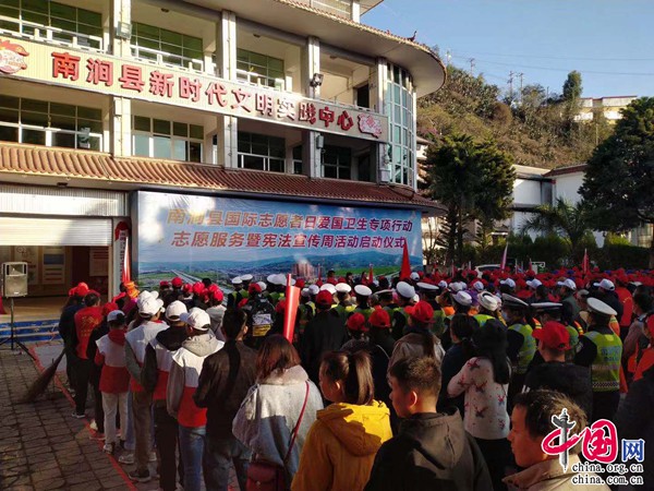 (南澗縣國際志愿者日愛國衛(wèi)生專項(xiàng)行動(dòng)志愿服務(wù)暨憲法宣傳周活動(dòng)啟動(dòng)儀式現(xiàn)場(chǎng) 南澗縣融媒體中心供圖 )
