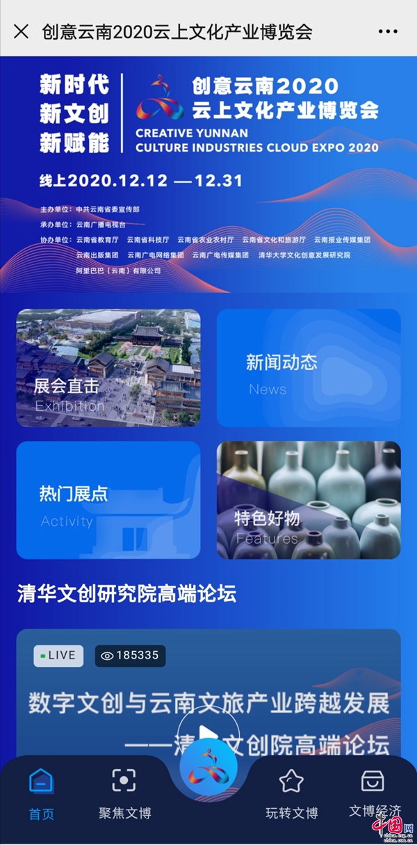 12月12日,創(chuàng)意云南2020云上文化產(chǎn)業(yè)博覽會(huì)(簡(jiǎn)稱“文博會(huì)”)正式拉開(kāi)序幕。線上云展會(huì)與昆明、玉溪、保山、麗江等線下分會(huì)場(chǎng)同時(shí)開(kāi)展。