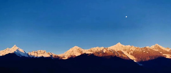 在晴日的凌晨,太陽光越過阻礙照射在雪山頂上,然后逐漸擴大,形成絕美的“日照金山”奇觀,持續(xù)20分鐘左右,最后雪山整體變白,失去金色影象;有時太陽已經(jīng)升起,月亮尚未落山,便形成難得一見的“日月同輝”奇觀。