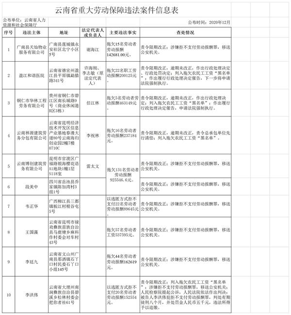 近日,云南省人力資源和社會保障廳向社會公布了一批重大勞動保障違法案件。本次公布的案件共10件,涉及5個用人單位和5個自然人,均是今年以來云南省部分州(市)、縣(市、區(qū))人力資源社會保障部門查處的工資支付類重大勞動保障違法案件,其中:7件因涉嫌拒不支付勞動報酬罪被移送公安機關偵辦,4件被列入拖欠農(nóng)民工工資“黑名單”,1件由總承包單位先行清償欠薪,1件法院已依法作出判決。