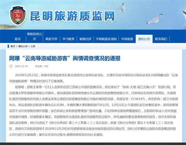 12月29日,昆明市旅游監(jiān)察支隊(duì)官方網(wǎng)站發(fā)布通報(bào),對(duì)“云南導(dǎo)游威脅游客”事件調(diào)查情況進(jìn)行公布。通報(bào)稱,經(jīng)調(diào)查事件基本屬實(shí)。昆明市文化和旅游局于2020年12月29日對(duì)導(dǎo)游郭某依法做出吊銷導(dǎo)游證的行政處罰。同時(shí),對(duì)涉事的云南陽(yáng)光旅游集團(tuán)有限公司已進(jìn)行立案調(diào)查,案件正在偵辦過程中,調(diào)查結(jié)果將及時(shí)向社會(huì)通報(bào)。