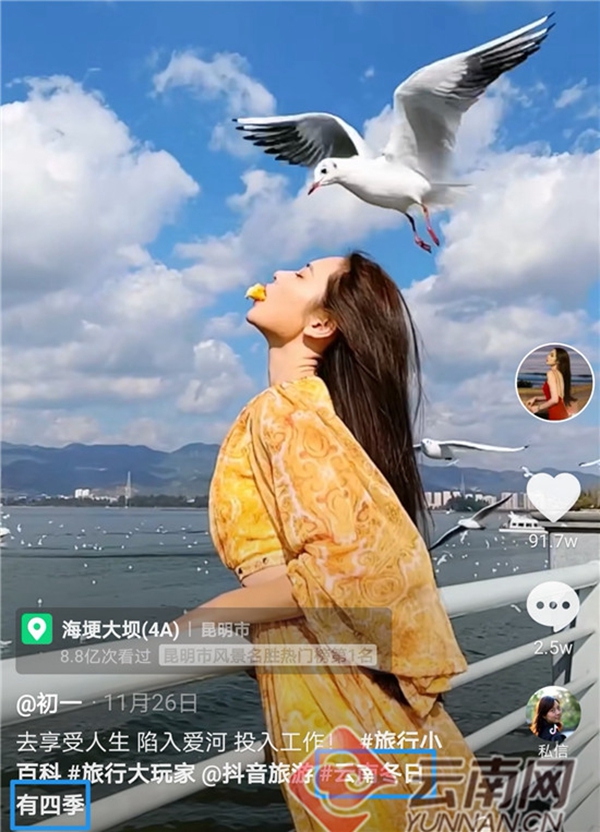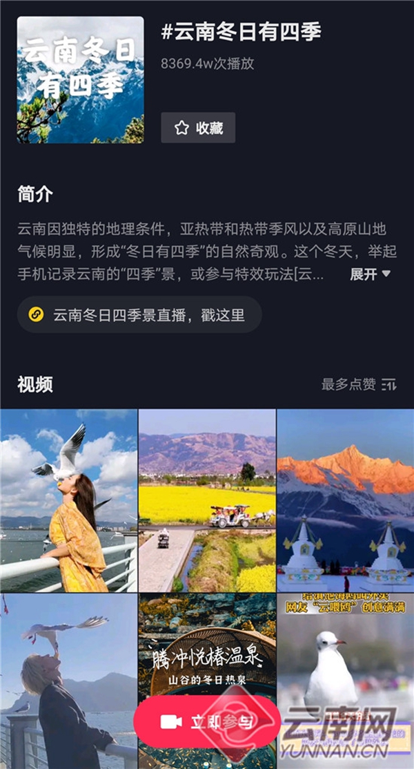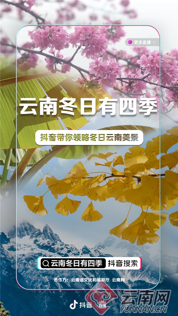 12月31日,由云南省文化和旅游廳攜手抖音平臺(tái)發(fā)起的“云南冬日有四季”互動(dòng)“話(huà)題+直播”活動(dòng)圓滿(mǎn)收官。17天里,來(lái)自省內(nèi)外網(wǎng)友積極參與#云南冬日有四季話(huà)題投稿,“解鎖”云南冬季中隱藏的“春、夏、秋、冬”,視頻累計(jì)播放量高達(dá)8369.4萬(wàn)次。