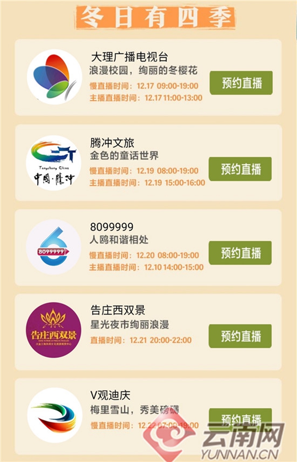 其中,12月16日,大理大學(xué)的冬櫻花直播帶2.4萬(wàn)網(wǎng)友感受了一把“春日”的浪漫;12月18日,騰沖銀杏村直播吸引了近萬(wàn)名網(wǎng)友共同走進(jìn)金色的童話(huà)世界;12月19日,海埂大壩直播帶6.6萬(wàn)網(wǎng)民連線“云南人的老朋友”紅嘴鷗;12月20日,告莊西雙景直播則帶著網(wǎng)友“穿越”回夏日穿短袖逛夜市的時(shí)光;12月22日,梅里雪山直播讓近萬(wàn)名網(wǎng)友一睹了“日照金山”勝景。