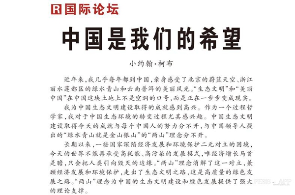 9月2日,《人民日報》刊發(fā)了世界著名生態(tài)經(jīng)濟學(xué)者、美國國家人文科學(xué)院院士小約翰·柯布《中國是我們的希望》的署名文章,再次點贊發(fā)展綠色經(jīng)濟,建設(shè)生態(tài)文明的普洱經(jīng)驗。去年,小約翰·柯布與10位國際專家學(xué)者出席普洱生態(tài)文明與綠色發(fā)展研討會,作出了“生態(tài)文明的未來在中國,綠色發(fā)展的示范看普洱”的高度評價。