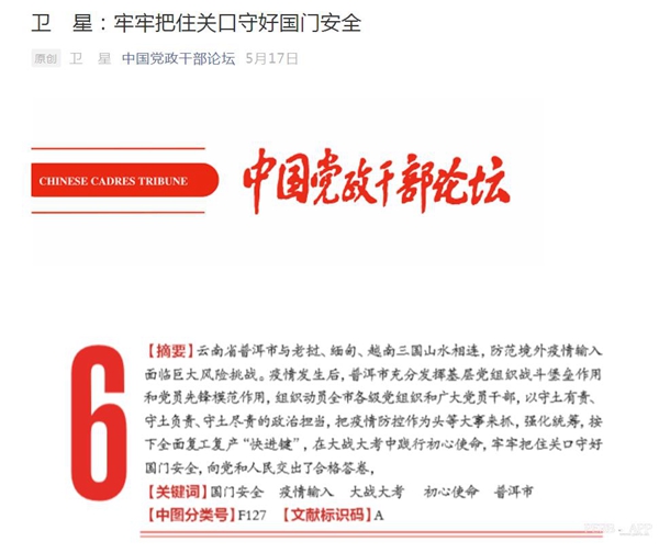 5月17日,中共中央黨校主辦的《中國黨政干部論壇》刊發(fā)了普洱市委書記衛(wèi)星的署名文章《牢牢把住關(guān)口守好國門安全》。文章全面闡述了普洱市認真貫徹落實習(xí)近平總書記重要指示批示精神,把統(tǒng)籌推進新冠肺炎疫情防控和經(jīng)濟社會發(fā)展作為檢驗“四個意識”牢固不牢固,“四個自信”堅定不堅定,“兩個維護”堅決不堅決的試金石,用守土有責、守土負責、守土盡責的政治擔當,牢牢把住關(guān)口守好國門安全的生動實踐。