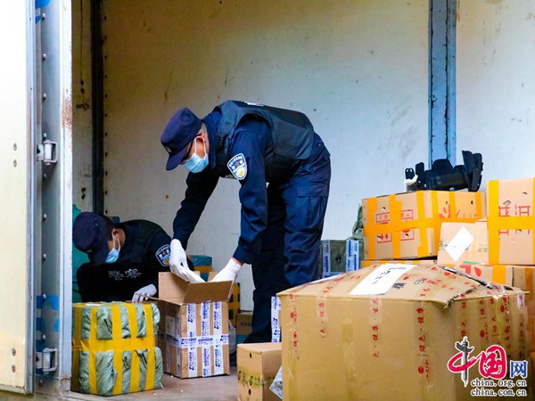 (蘇平(右一)檢查進出邊境的快遞包裹)