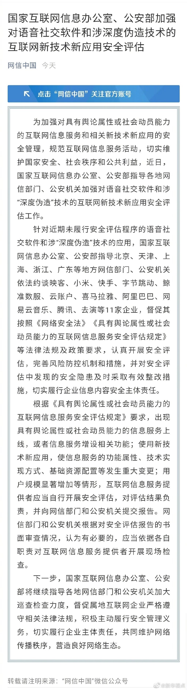 為加強對具有輿論屬性或社會動員能力的互聯(lián)網(wǎng)信息服務(wù)和相關(guān)新技術(shù)新應(yīng)用的安全管理,規(guī)范互聯(lián)網(wǎng)信息服務(wù)活動,切實維護國家安全、社會秩序和公共利益,近日,國家互聯(lián)網(wǎng)信息辦公室、公安部指導(dǎo)各地網(wǎng)信部門、公安機關(guān)加強對語音社交軟件和涉“深度偽造”技術(shù)的互聯(lián)網(wǎng)新技術(shù)新應(yīng)用安全評估工作。