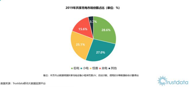 2019年時(shí),街電、小電、怪獸充電、來電“三電一獸”的市場格局基本形成。根據(jù)TrustData移動(dòng)大數(shù)據(jù)監(jiān)測平臺(tái)的統(tǒng)計(jì),2019年,上述4家企業(yè)的市場份額占比分別為28.6%、27%、25.1%和15.6%,來電科技位居第四。