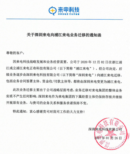 根據(jù)來電科技官網(wǎng)首頁發(fā)布的《關(guān)于深圳來電向浦江來電業(yè)務(wù)遷移的通知函》,因戰(zhàn)略發(fā)展和業(yè)務(wù)經(jīng)營需要,深圳來電于2020年12月02日在浙江浦江成立浦江來電,后續(xù)業(yè)務(wù)逐步由深圳來電向浦江來電遷移,包括業(yè)務(wù)合同簽署主體、資金收/付款主體等,都將由深圳來電變更為浦江來電。