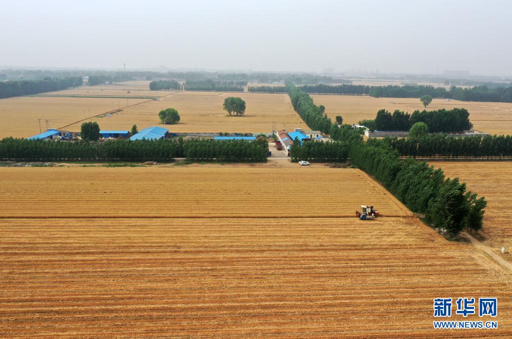6月10日,收割機(jī)在山東鄒城太平鎮(zhèn)一處麥田收割小麥(無人機(jī)照片)。