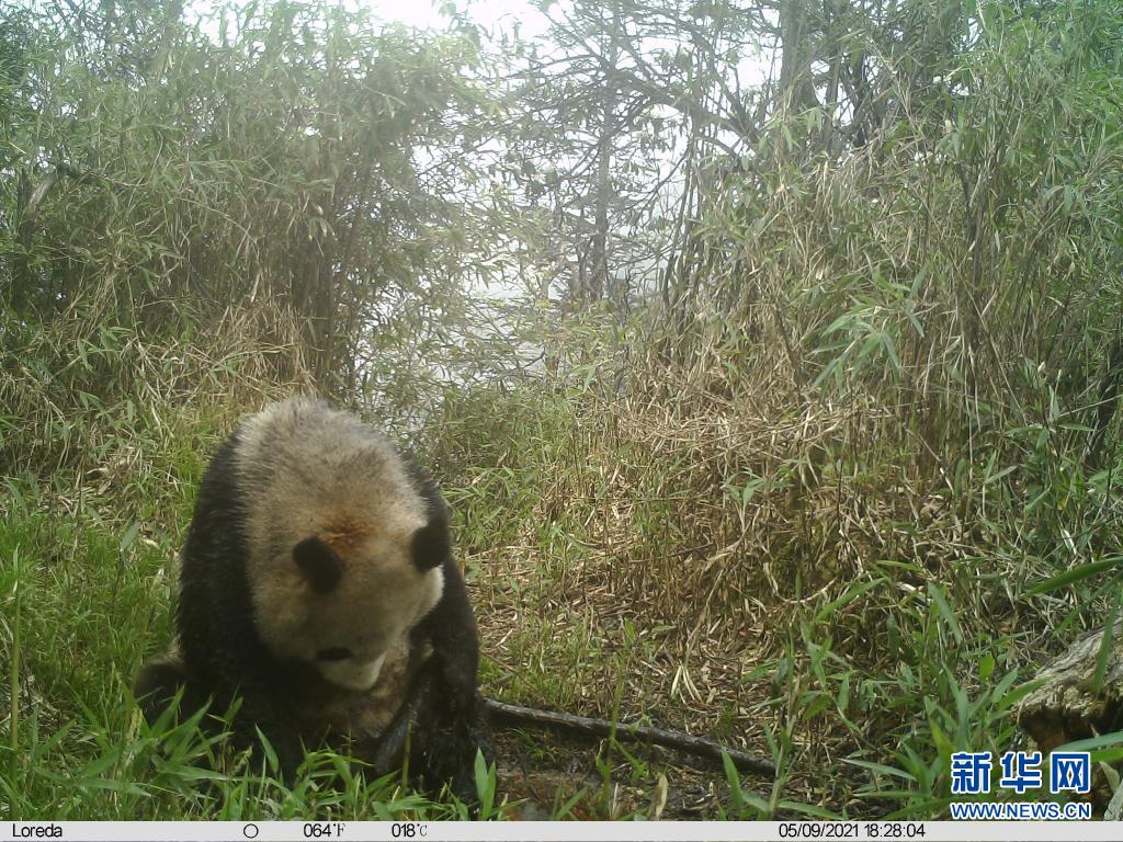 這是安裝于四川省都江堰龍池小草坡區(qū)域的紅外線相機拍攝到的野生大熊貓活動畫面(5月9日攝)。