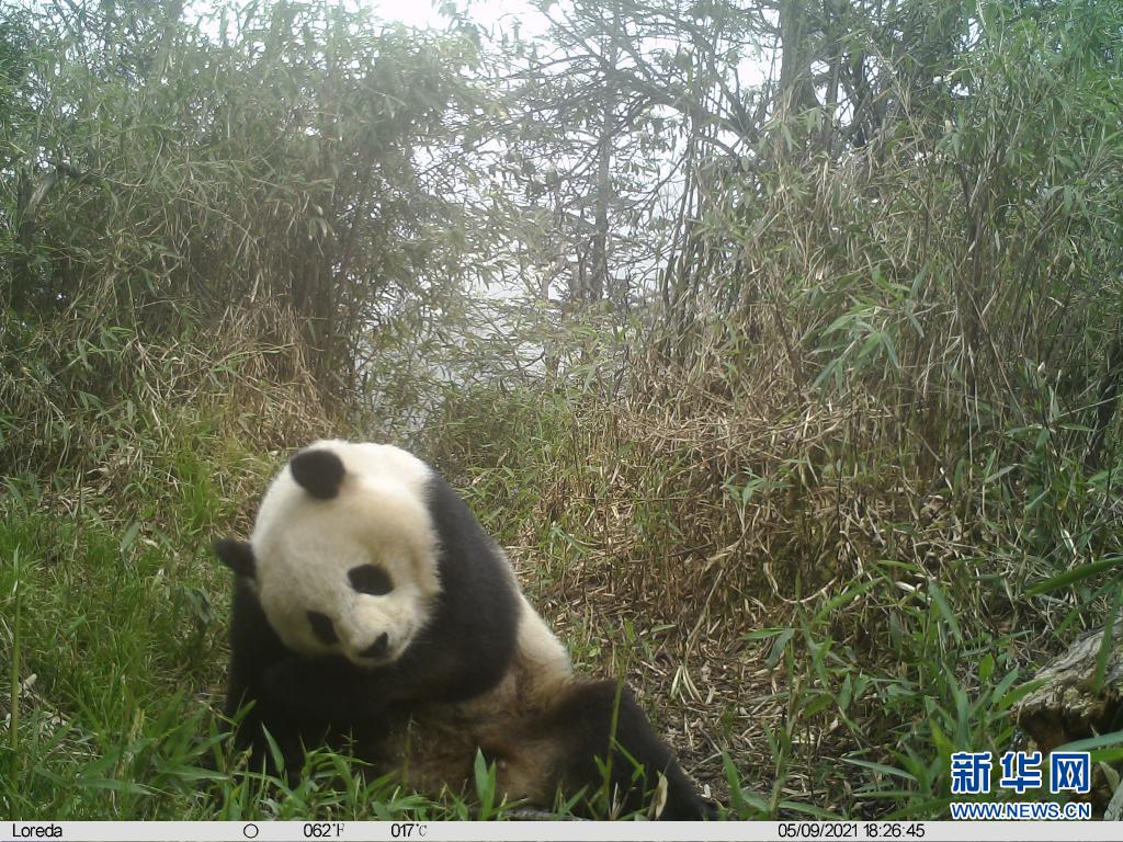 這是安裝于四川省都江堰龍池小草坡區(qū)域的紅外線相機(jī)拍攝到的野生大熊貓活動畫面(5月9日攝)。