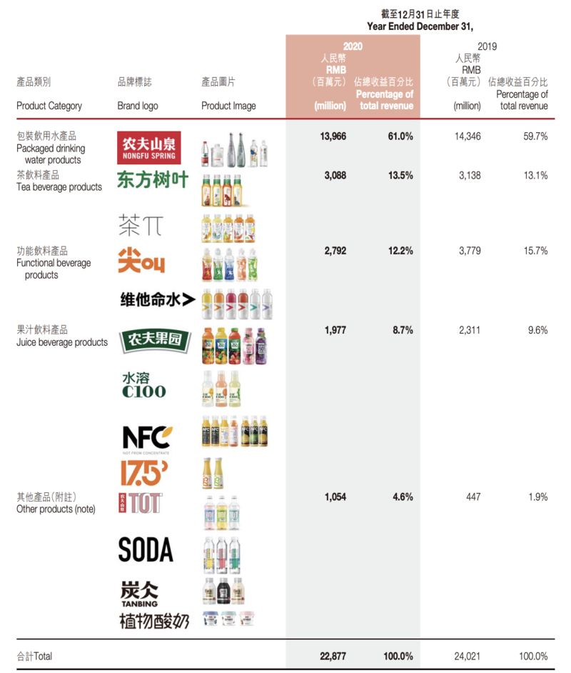 分產(chǎn)品來看,2020年,農(nóng)夫山泉包裝飲用水產(chǎn)品收入較2019年下降2.6%,占2020年總收益的61.0%。而包括蘇打水飲料、咖啡、植物酸奶等產(chǎn)品飲料在內(nèi)的“其他產(chǎn)品”2020年收益為10.54億元,較2019年上升135.8%,但僅占2020年總收益的4.6%。由此可見,新品雖成為業(yè)績的亮點(diǎn)之一,但是收益卻微乎其微。