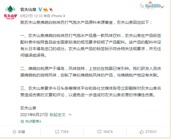 6月27日,農(nóng)夫山泉回應(yīng)稱研發(fā)人員依據(jù)拂曉桃的獨(dú)特風(fēng)味,創(chuàng)造了類似拂曉桃風(fēng)味的產(chǎn)品,與拂曉桃產(chǎn)地沒有關(guān)聯(lián)。從回應(yīng)來看,農(nóng)夫山泉避重就輕地選擇了虛假宣傳這一項(xiàng)“罪名”。