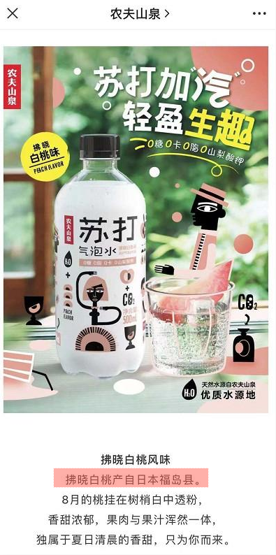 根據(jù)農(nóng)夫山泉官方公眾號4月1日發(fā)布的一篇推送文章中顯示,這款氣泡水在宣傳標(biāo)語上,將拂曉白桃產(chǎn)自日本福島,作為產(chǎn)品的賣點(diǎn)之一。