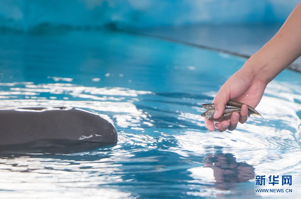 7月5日,中科院水生所白鱀豚館飼養(yǎng)員給長江江豚喂食。新華社記者肖藝九攝