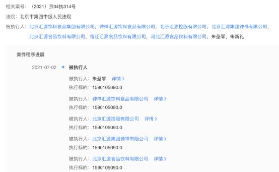 近日,據(jù)天眼查,包括北京匯源飲料食品集團(tuán)有限公司(下稱“北京匯源集團(tuán)”)等在內(nèi)的7家匯源果汁旗下公司,以及朱新禮、朱圣琴新增一條被執(zhí)行人信息,執(zhí)行標(biāo)的超15.90億元。天眼查還顯示,北京匯源集團(tuán)歷史上已收到100次限制消費(fèi)令,其中2020年1月14日至7月27日,匯源飲料食品公司收到4次欠稅公告,欠稅總金額超137萬(wàn)元。