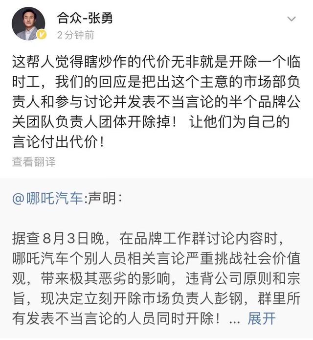 事件發(fā)生之后,哪吒汽車CEO張勇在社交平臺上表示,“把出這個主意的市場公關(guān)部負(fù)責(zé)人和參與討論并發(fā)表不當(dāng)言論的半個品牌公關(guān)團隊負(fù)責(zé)人團隊開除掉!”