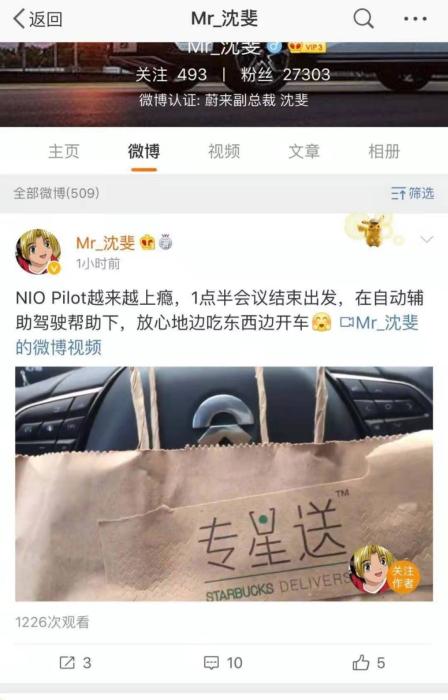 蔚來(lái)副總裁沈斐曾經(jīng)發(fā)微博稱,“NIO Pliot越來(lái)越上癮了,一點(diǎn)半會(huì)議結(jié)束出發(fā),在自動(dòng)輔助駕駛幫助下,放心邊吃東西邊開(kāi)車了?!蹦壳?,此條微博已被刪除。