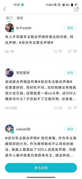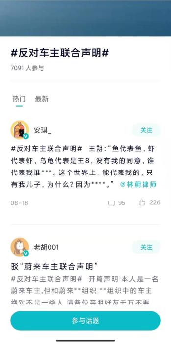 8月18日晚間,有車主在蔚來(lái)APP創(chuàng)建了#反對(duì)車主聯(lián)合聲明#的話題。截至19日發(fā)稿時(shí),已有超7000人參與話題。