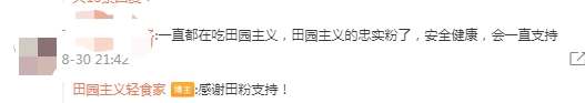 也有網(wǎng)友表示“相信田園主義”“一直都在吃田園主義,田園主義的忠實(shí)粉了,安全健康,會(huì)一直支持”。