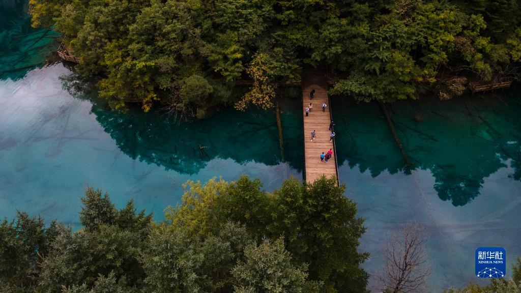 在四川省九寨溝景區(qū),游客走在五花海的棧道上(9月27日攝,無人機(jī)照片)。