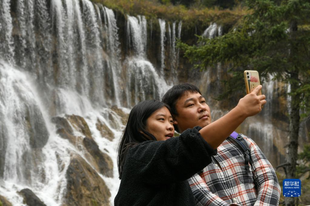 在四川省九寨溝景區(qū),游客在諾日朗瀑布前拍照留念(9月27日攝)。