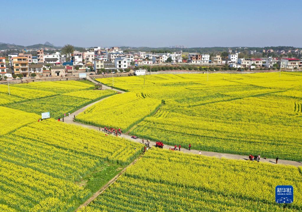 3月8日,游客在湖南省道縣祥霖鋪鎮(zhèn)兩河口村油菜花田游玩(無(wú)人機(jī)照片)。