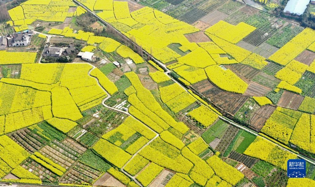 3月8日在四川省眉山市洪雅縣將軍鎮(zhèn)陽(yáng)坪村拍攝的油菜花田(無(wú)人機(jī)照片)。