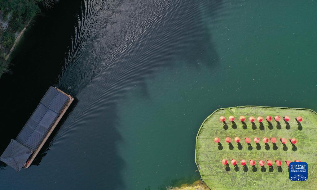 3月7日,游船行駛在張家界市武陵源區(qū)寶峰湖景區(qū)水面上(無人機(jī)照片)。