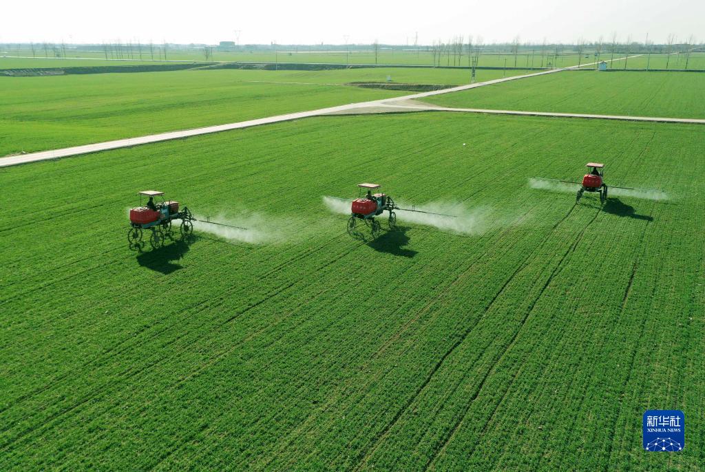 3月7日,農機在河北邢臺市南和區(qū)閻里鄉(xiāng)的麥田開展春管作業(yè)(無人機照片)。