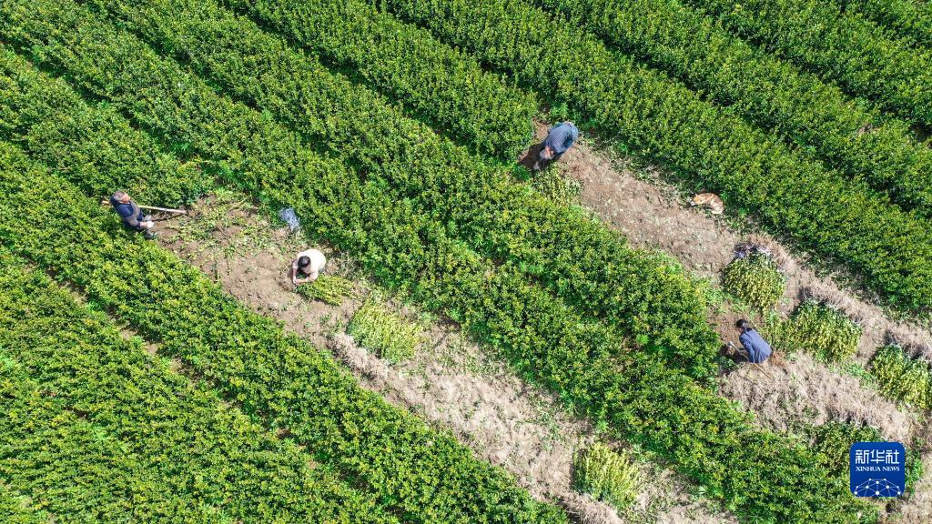 3月7日,在湖南省常寧市羅橋鎮(zhèn)石盤村,村民在起挖油茶苗(無人機照片)。