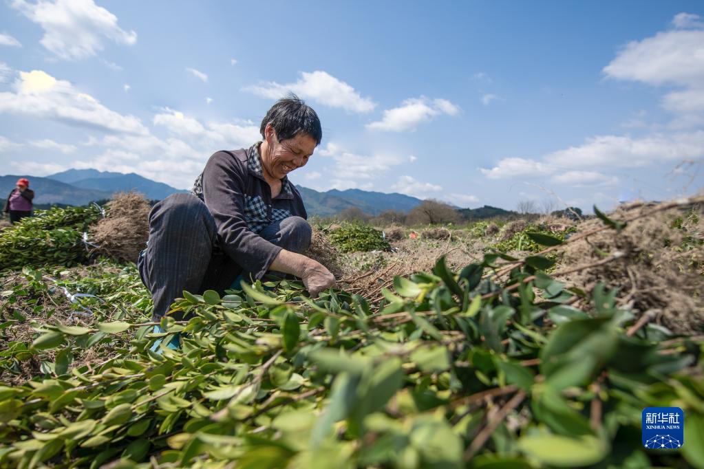 3月7日,在湖南省常寧市羅橋鎮(zhèn)石盤(pán)村,村民整理準(zhǔn)備外銷(xiāo)的油茶苗。